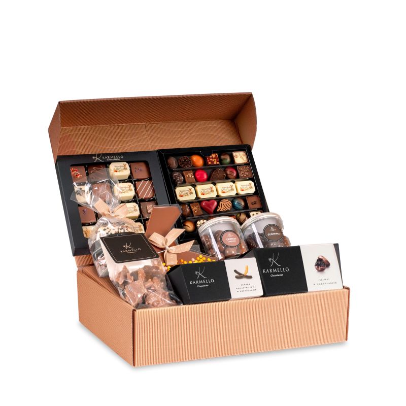 Wielkanocna szkatuła pełna czekoladowych słodkości to esencja świątecznej przyjemności zamknięta w eleganckiej formie. W środku czekają starannie wyselekcjonowane przysmaki, które kuszą bogactwem smaków, dopracowanymi dekoracjami i kolorową, wiosenną oprawą. W szkatule znajdziecie między innymi kolekcję ręcznie dekorowanych pralin, zestaw czekoladek, starannie dobrane bakalie oraz piernikowe ciasteczka studenckie, które dodają całości korzennej nuty i przyjemnej chrupkości. Całość przygotowana specjalnie na Wielkanocny czas.