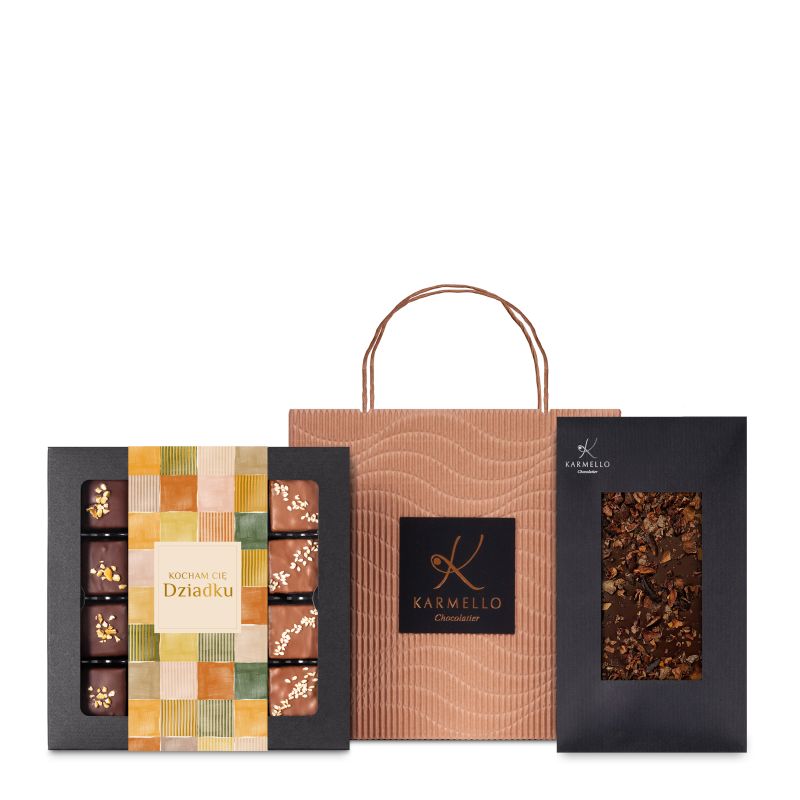 Torebka dla Dziadka Bez Dodatku Cukru to starannie skomponowany zestaw czekoladowy, który doskonale sprawdzi się jako upominek z okazji Dnia Dziadka.