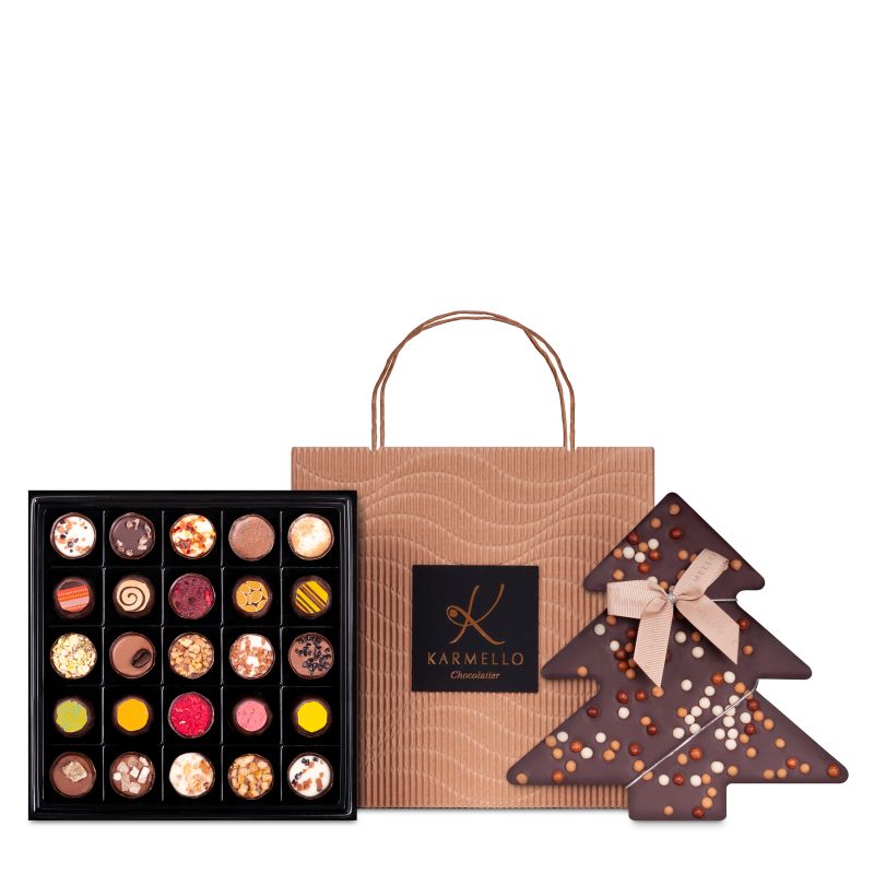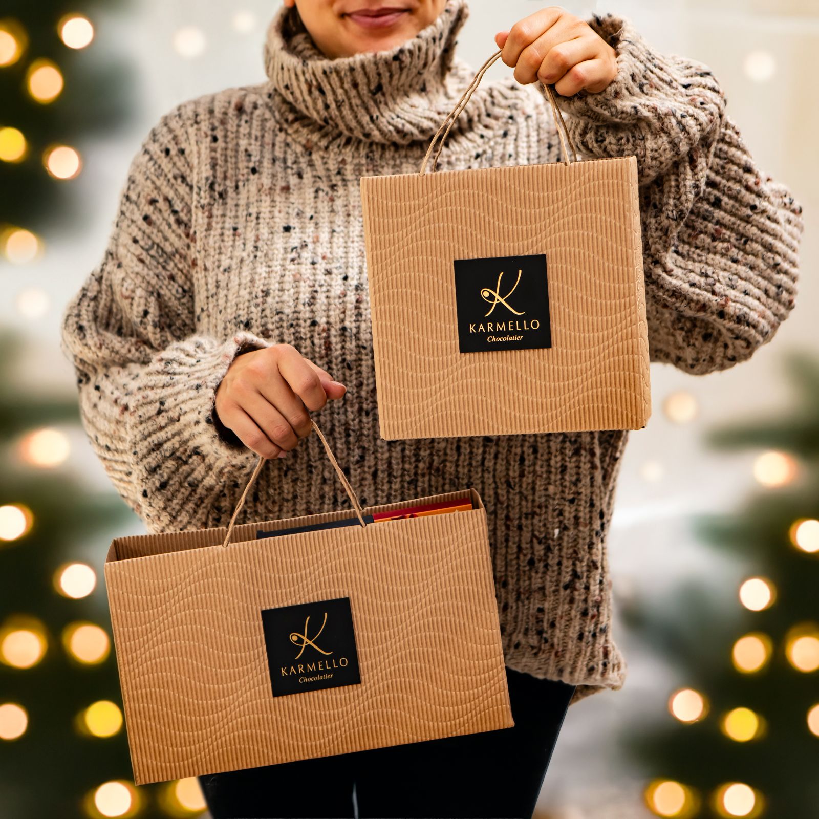 Świąteczna torebka pełna słodkości! W środku znajdziesz czekoladowe połączenie elegancji, smaku i świątecznej radości. Idealny prezent dla miłośników czekolady, który wprowadzi w magiczny nastrój Bożego Narodzenia.