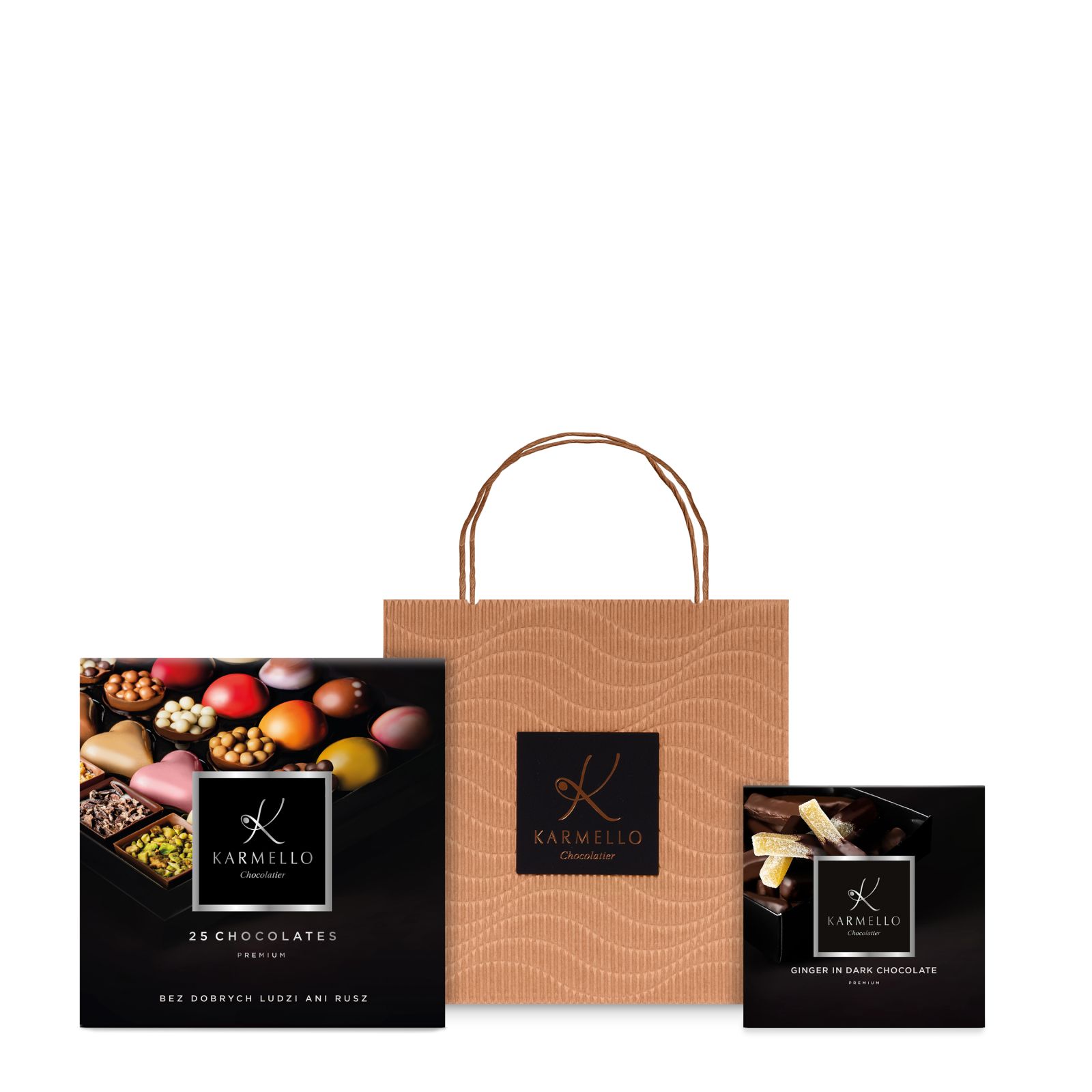 Zestaw, który łączy elegancję i wyrafinowany smak. W jego skład wchodzi kolekcja 25 czekoladek Signature – kompozycja pełna aromatu, finezji i czekoladowego kunsztu – oraz Imbir w Czekoladzie, o intrygującym, rozgrzewającym charakterze. To duet, który zachwyca różnorodnością doznań i stanowi doskonały pomysł na wyjątkowy prezent.