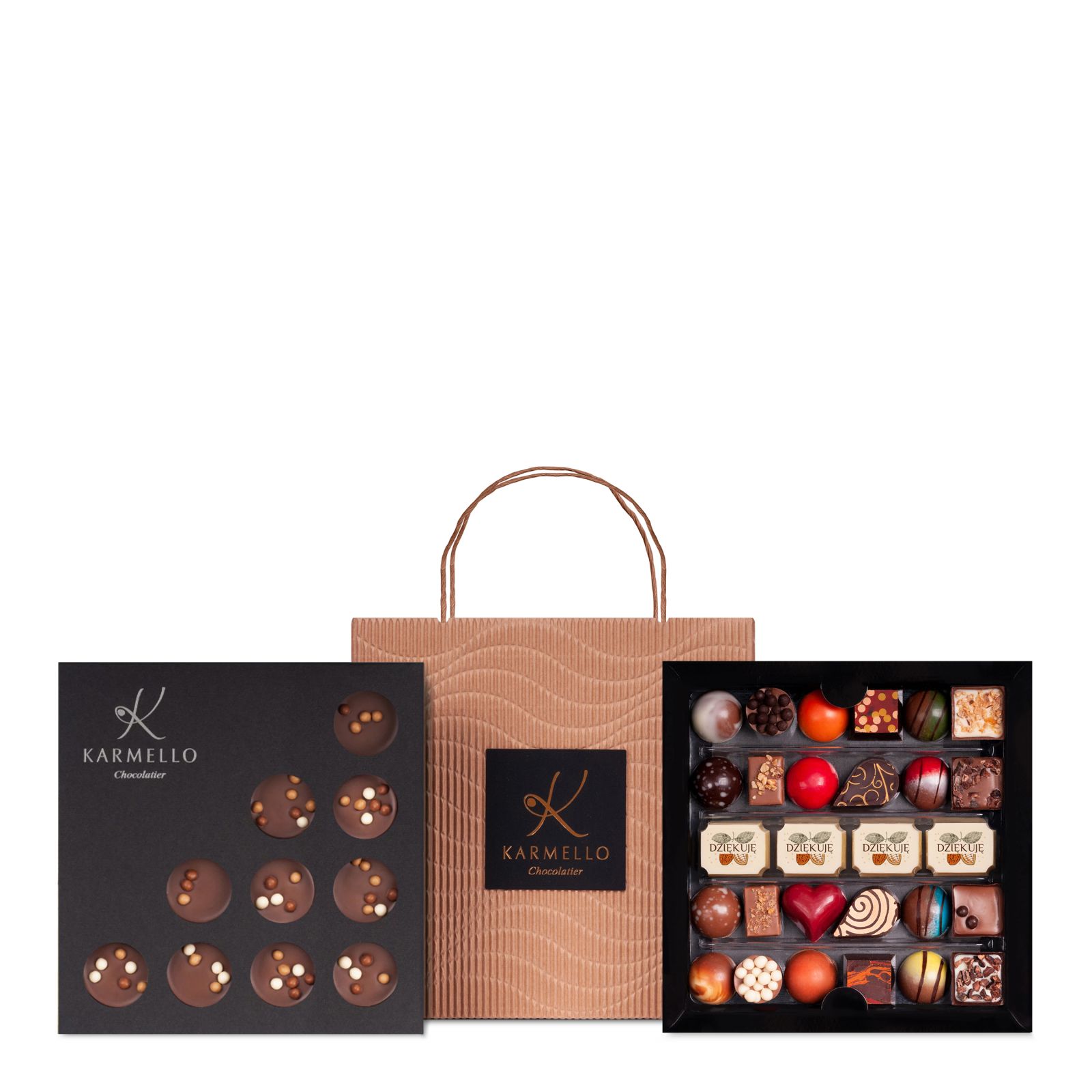 Elegancka torebka kryjąca kolekcję ręcznie tworzonych czekoladek – wśród nich wyjątkowe czekoladki z napisem „Dziękuję” oraz praliny z aksamitnym nadzieniem i chrupiącymi fruzzlami karmelowymi. To starannie dopracowany zestaw, który łączy elegancję z wyrafinowanym smakiem i staje się słodką formą wdzięczności.