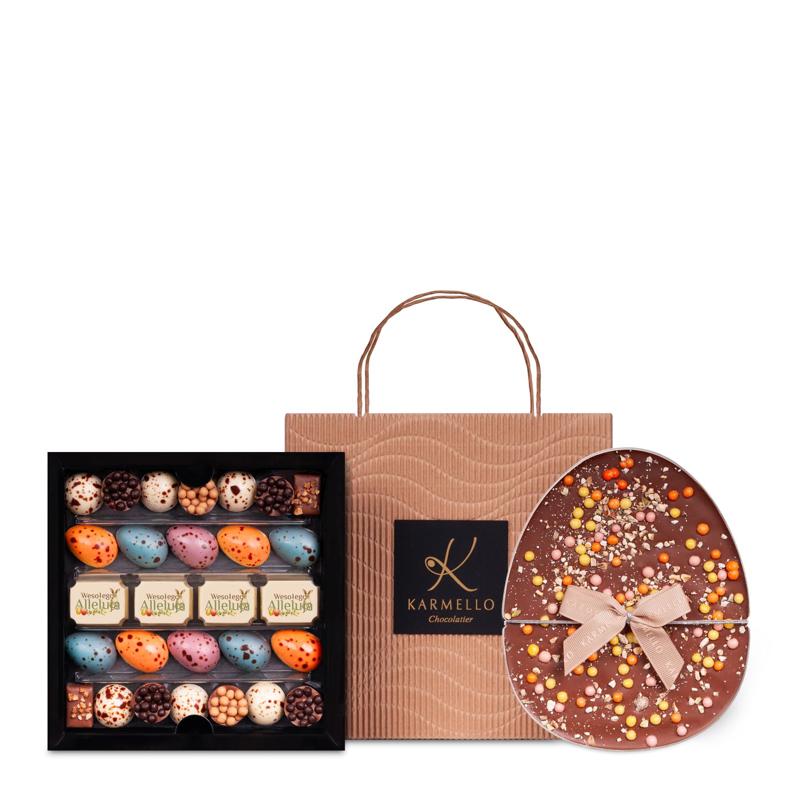 Zestaw wielkanocny z czekoladowymi pisankami w pięciu smakach i efektownym mlecznym jajkiem obsypanym chrupiącymi dodatkami. Najwyższa jakość składników i dopracowana forma, która zachwyca smakiem i wyglądem.