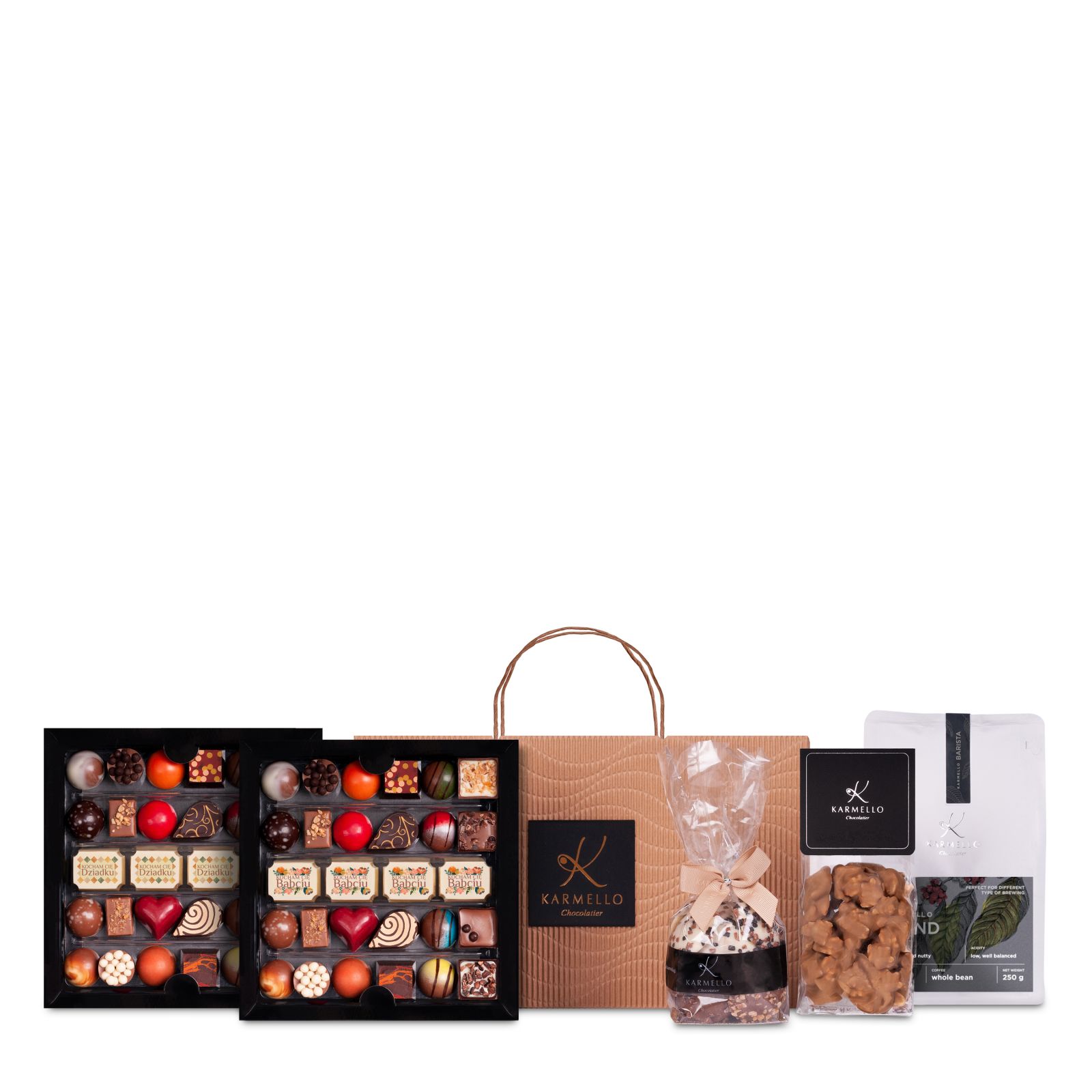 Ten wyjątkowy zestaw łączy w sobie wszystko, co otula ciepłem i przywołuje najpiękniejsze rodzinne wspomnienia. W środku czekają czekoladki stworzone specjalnie dla Babci i dla Dziadka — każde pudełko z własnym, osobistym akcentem — a obok nich chrupiący duet: ciasteczka studenckie w różnych odsłonach oraz korzenne ciasteczka zatopione w mlecznej czekoladzie. Całość dopełnia aromatyczna kawa Karmello, idealna na spokojny poranek lub popołudnie spędzone we dwoje.