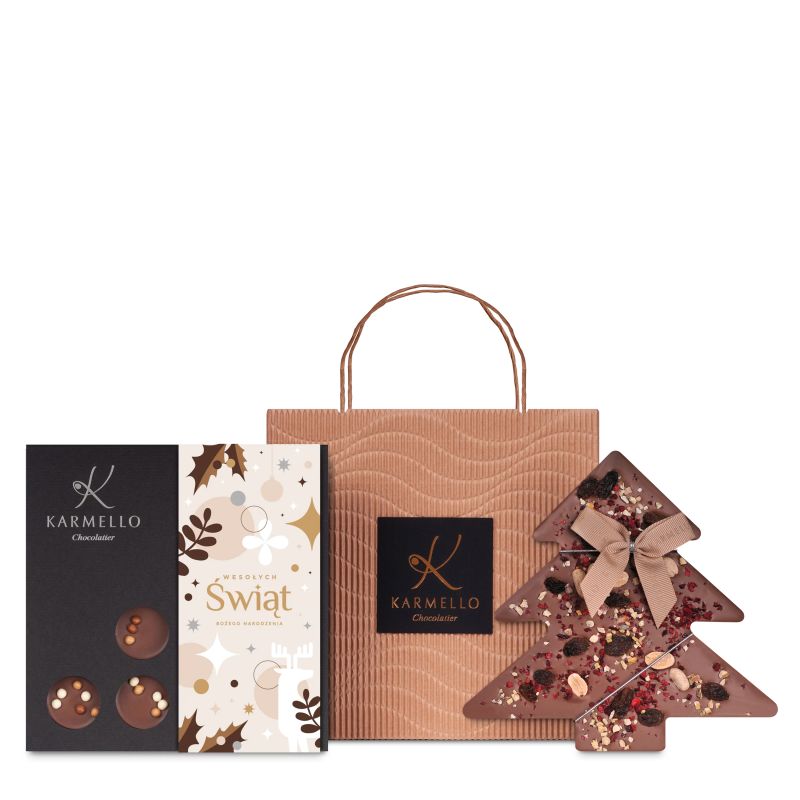 Świąteczna torebka pełna słodkich niespodzianek! W środku znajdziesz czekoladowe fruzzle z aksamitnym karmelowym nadzieniem oraz czekoladę w kształcie choinki – połączenie elegancji, smaku i świątecznej radości. Idealny prezent dla miłośników czekolady, który wprowadzi w magiczny nastrój Bożego Narodzenia.