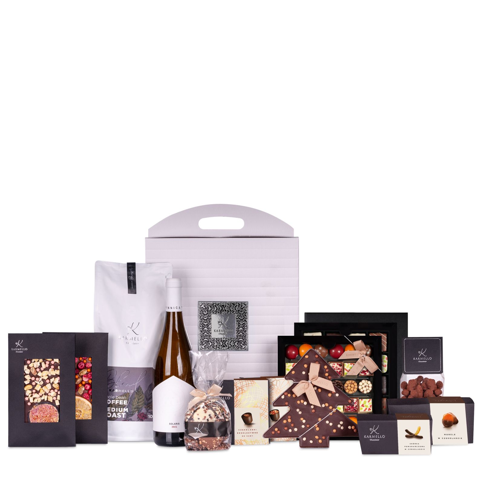 Nowość od Karmello ! Nowy kształt eleganckiego, białego opakowania zawiera różnorodne produkty Karmello . Zestawy czekoladek wykonane na bazie belgijskiej czekolady, bakalie w czekoladzie oraz czekolada w kształcie choinki zachwycą wzrok i podniebienie każdego smakosza czekolady. Oprócz wyśmienitych czekoladek wykonanych na bazie belgijskiej czekolady znajdziesz również wytrawne Wino Solaris. Zestaw idealny jako upominek dla wyjątkowej osoby w świąteczny czas.