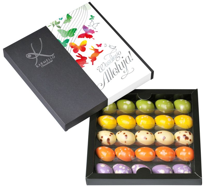 bogactwo barw i smaków czekoladek skomponowane w niezwykle efektowny zestaw, którym możesz obdarować najbliższych podczas świątecznego spotkania lub delektować się w domowym zaciszu, tuż po śniadaniu wielkanocnym. czekoladki zapakowane w eleganckie, klasycznej formy czarne pudełko, któremu powiew wiosennej świeżości nadaje ozdobna mufka.