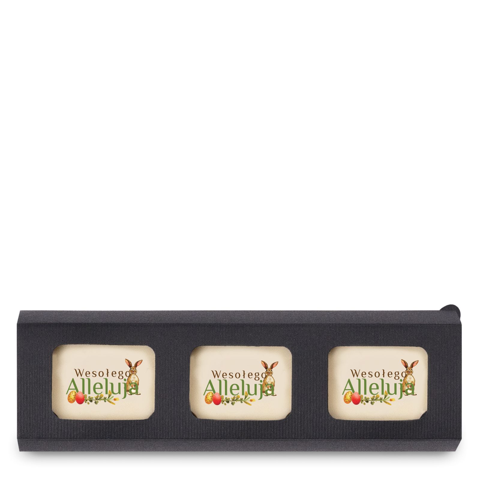 Elegancka potrójna wizytówka "Alleluja" to subtelna dekoracja na Wielkanoc, doskonała do wręczenia z życzeniami. W zestawie znajdują się czekoladki o piernikowym smaku, które otoczone są atrakcyjnym motywem- wiosennymi akcentami, takimi jak króliczki, jajka i kwiaty.