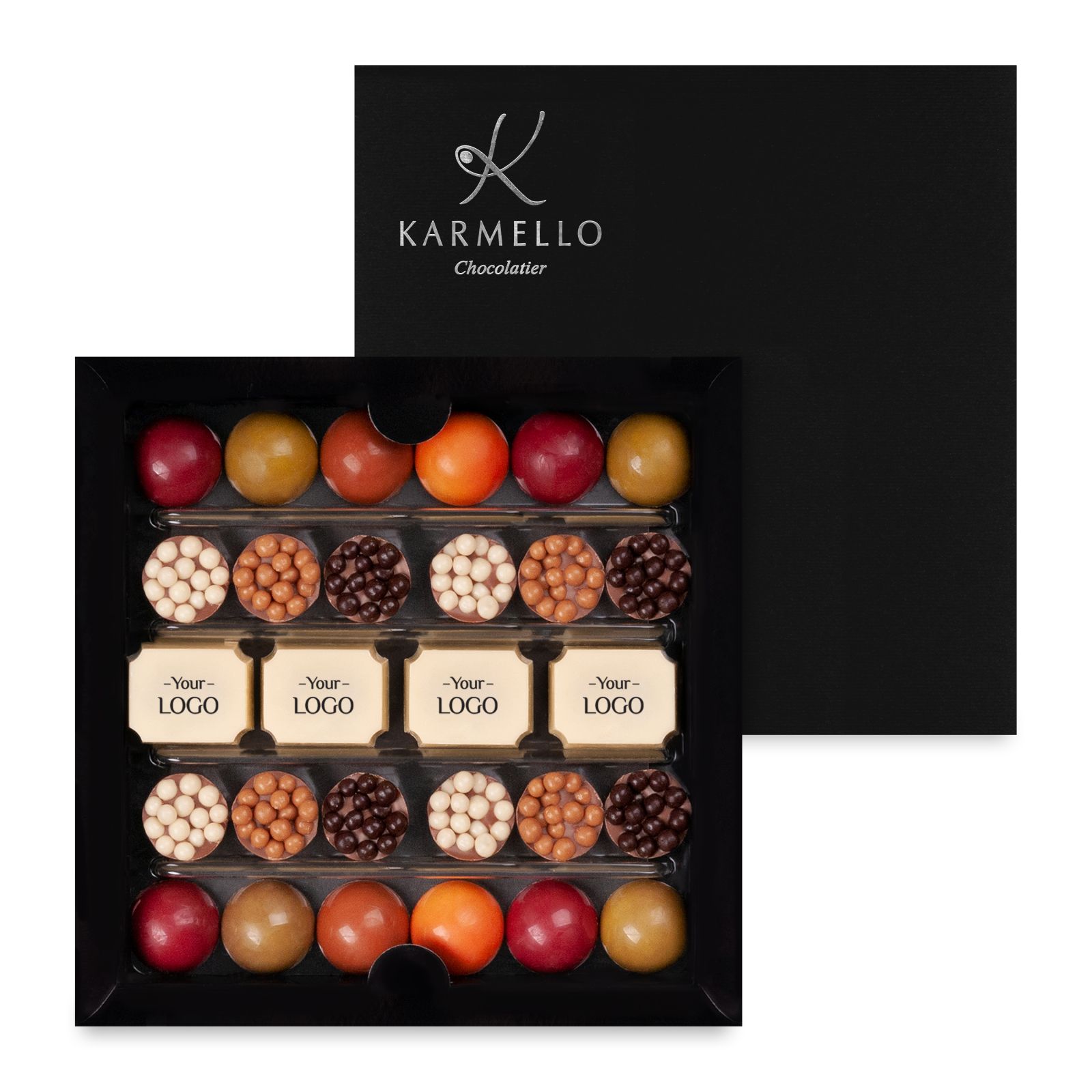 Połączenie słodkiego owocowo-karmelowego smaku z wyrazistym orzechowym nadzieniem gianduja. Zwieńczeniem zestawu są czekoladki z logo, które dodadzą mu bardziej firmowego charakteru.