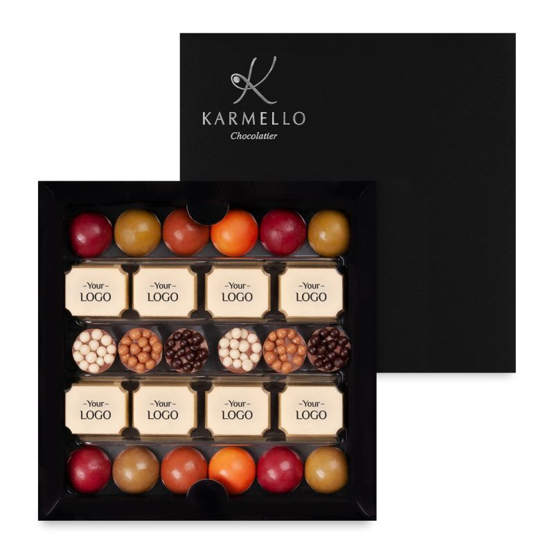 Połączenie słodkiego owocowo-karmelowego smaku z wyrazistym orzechowym nadzieniem gianduja. Zwieńczeniem zestawu są czekoladki z logo, które dodadzą mu bardziej firmowego charakteru.