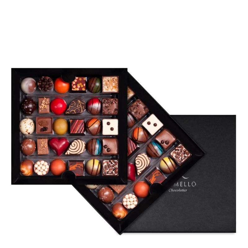Eleganckie, minimalistyczne pudełko skrywa 60 wyjątkowych w smaku i formie czekoladek. Kompozycja nut orzechowych, stanowczych smaków alkoholowych uzupełniona o soczyste, owocowe słodkości pozwoli Twoim partnerom biznesowym i pracownikom odkryć nowe, nieznane dotąd płaszczyzny doznań smakowych.