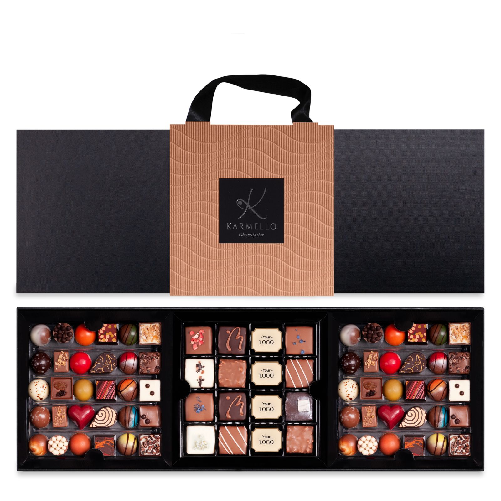 Potrójna klasyka – kolekcja 16 pralin w akompaniamencie dwóch kolekcji Karmello Standard. Kompozycja idealna na prezent dla pracowników i kontrahentów biznesowych – brązowa opaska ułatwi wręczenie podarunku.
