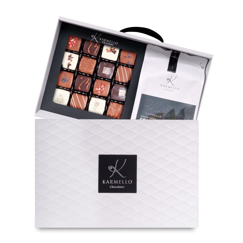 Połączenie zestawu pralin oraz świeżo palonej, ziarnistej kawy Karmello zamknięte w praktycznym i eleganckim opakowaniu Neseser. Idealna propozycja na podarunek dla pracowników lub kontrahentów biznesowych.