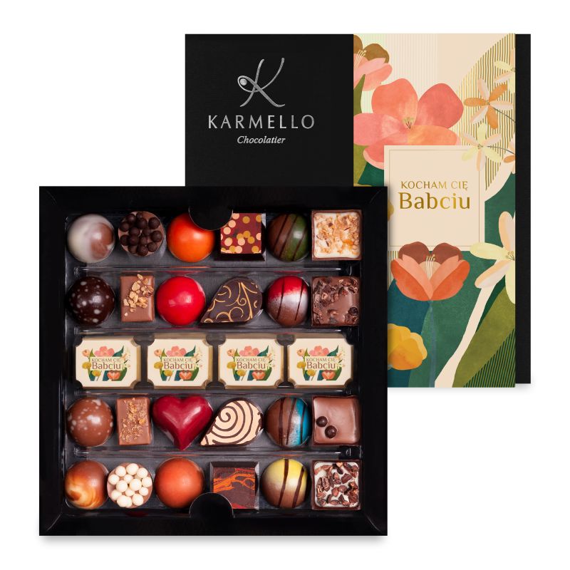 Wyjątkowa kompozycja czekoladek skomponowana tak, aby zachwycić każdą obdarowaną Babcie. Zestaw dodatkowo zawiera czekoladki z okazjonalnym nadrukiem oraz opaskę z napisem „Kocham Cię Babciu”.