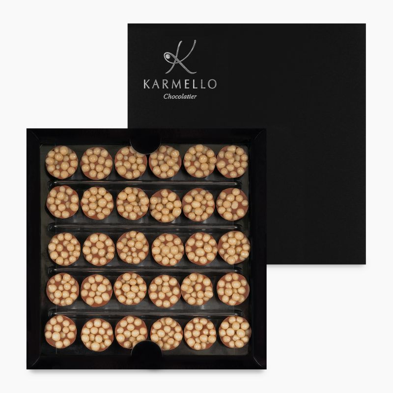 Kubeczki z nadzieniem gianduja udekorowane chrupiącymi perełkami o smaku karmelowym.