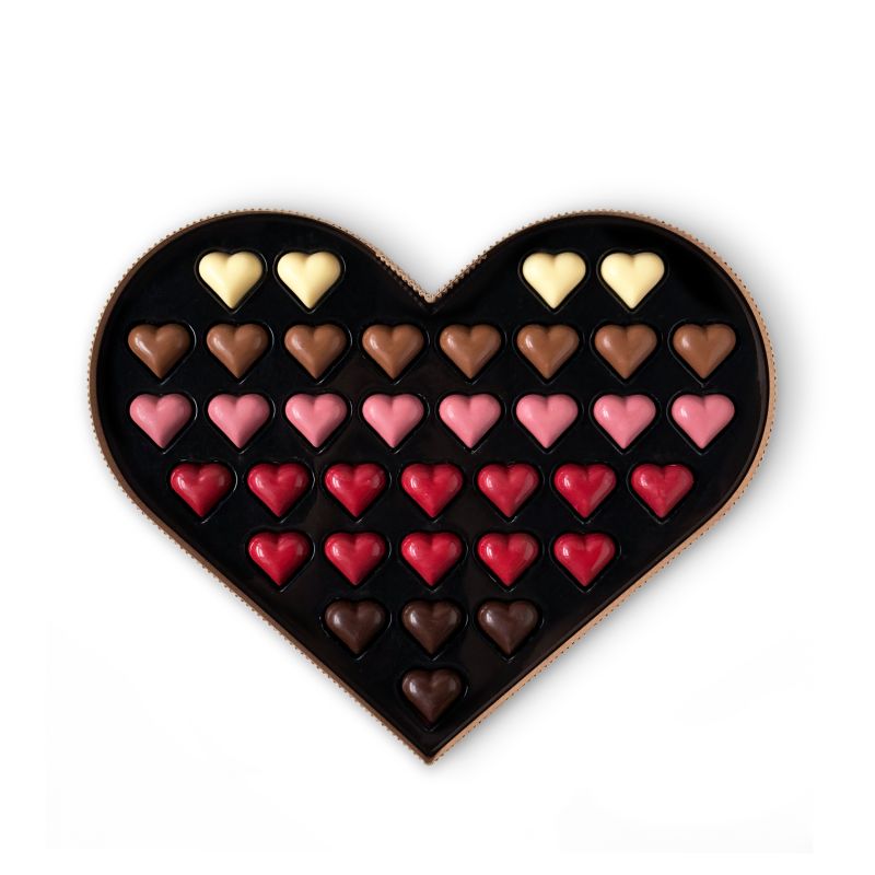 36 czekoladowych serduszek, które zamieniają Walentynki w moment pełen bliskości i słodkich emocji. Każde rozpływa się w ustach inaczej – jedne otulają waniliową delikatnością, inne zaskakują owocową ruby, a kolejne kuszą karmelową głębią przełamaną nutą soli. Zamknięte w eleganckim opakowaniu w kształcie serca tworzą gest, który opowiada o uczuciach z klasą i smakiem.