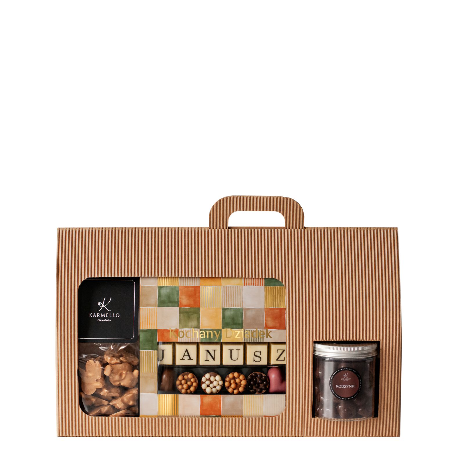 W tym eleganckim zestawie czeka „Słodka wiadomość dla Dziadka” z opaską — drobny, ciepły akcent, który pozwala powiedzieć więcej niż słowa. Obok znajdziesz intensywne w smaku ziarno kakaowca oraz aksamitny krem Karmello, idealny do porannej kromki lub popołudniowej kawy.