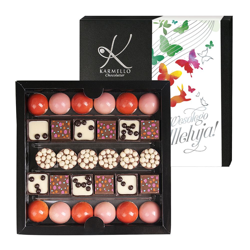 bogactwo barw i smaków czekoladek skomponowane w niezwykle efektowny zestaw, którym możesz obdarować najbliższych podczas świątecznego spotkania lub delektować się w domowym zaciszu, tuż po śniadaniu wielkanocnym. czekoladki zapakowane w eleganckie, klasycznej formy czarne pudełko z dekoracyjną mufką.