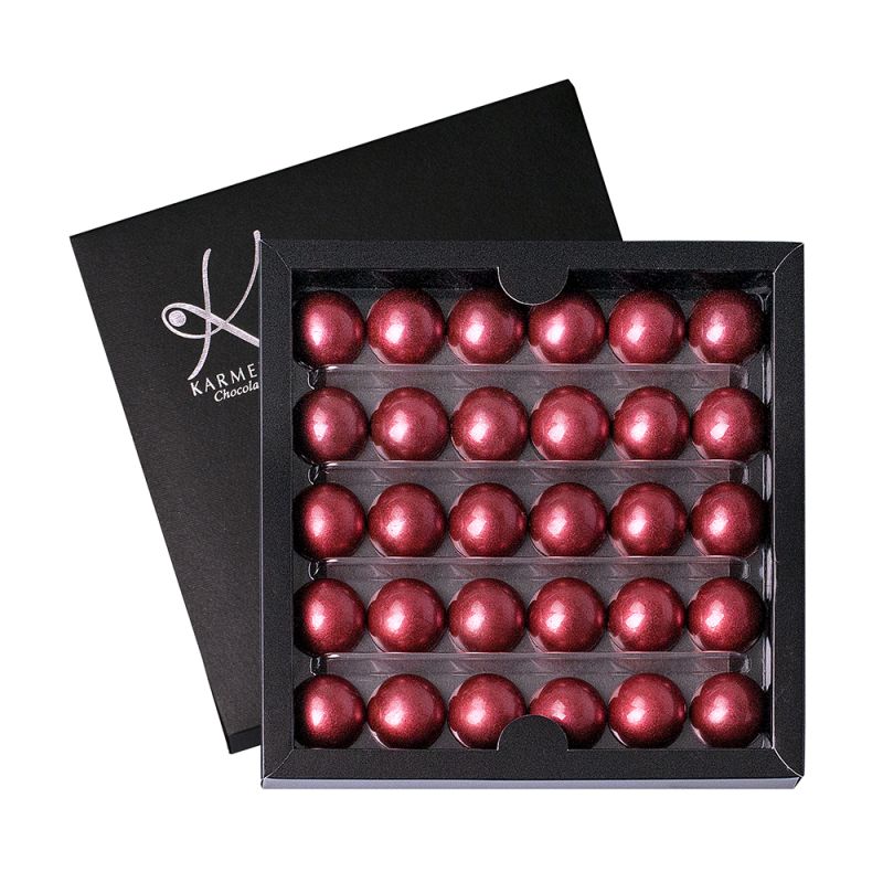aromatyczna, ciemna czekolada skrywa połączenie subtelnego smaku białej czekolady i orzeźwiającej wiśni.